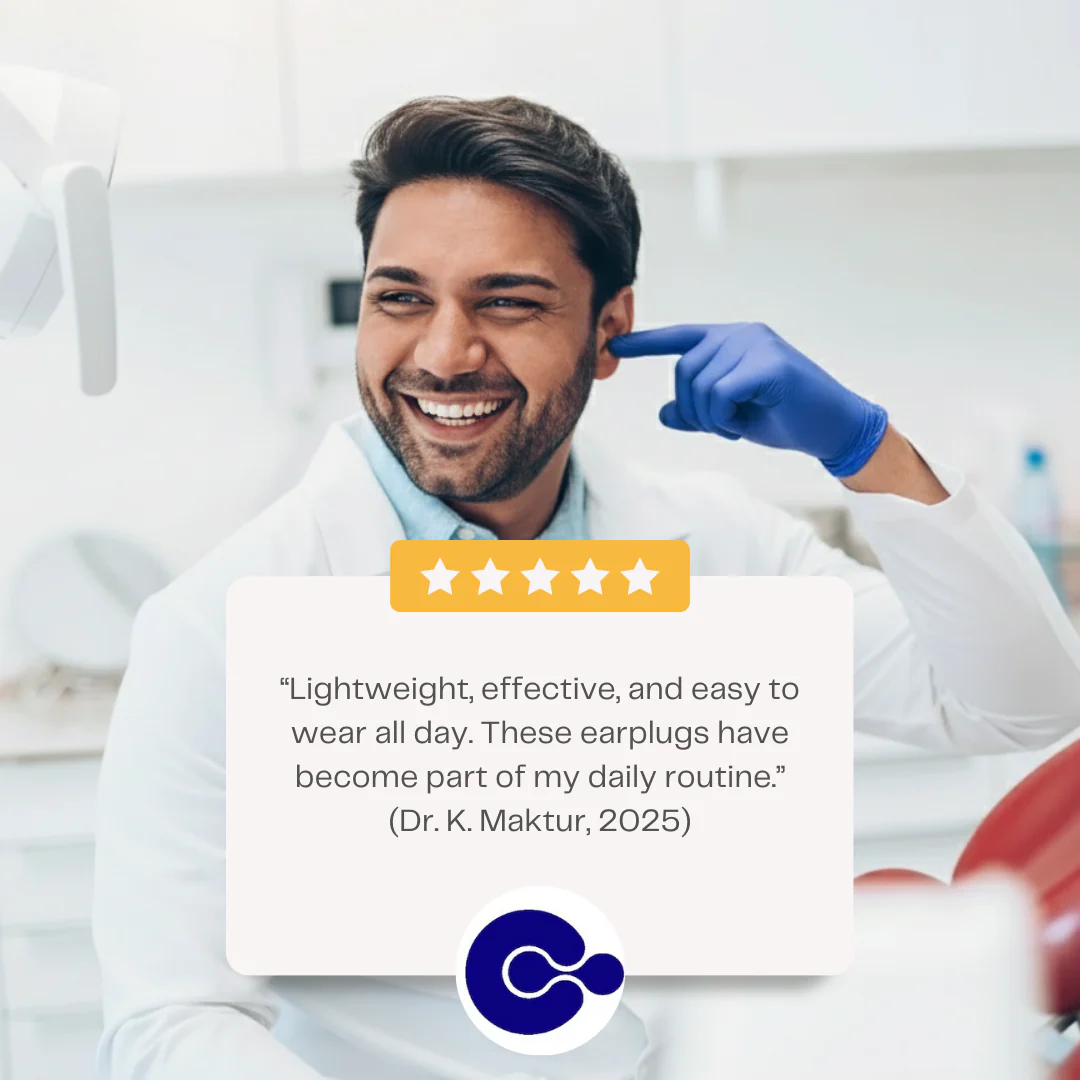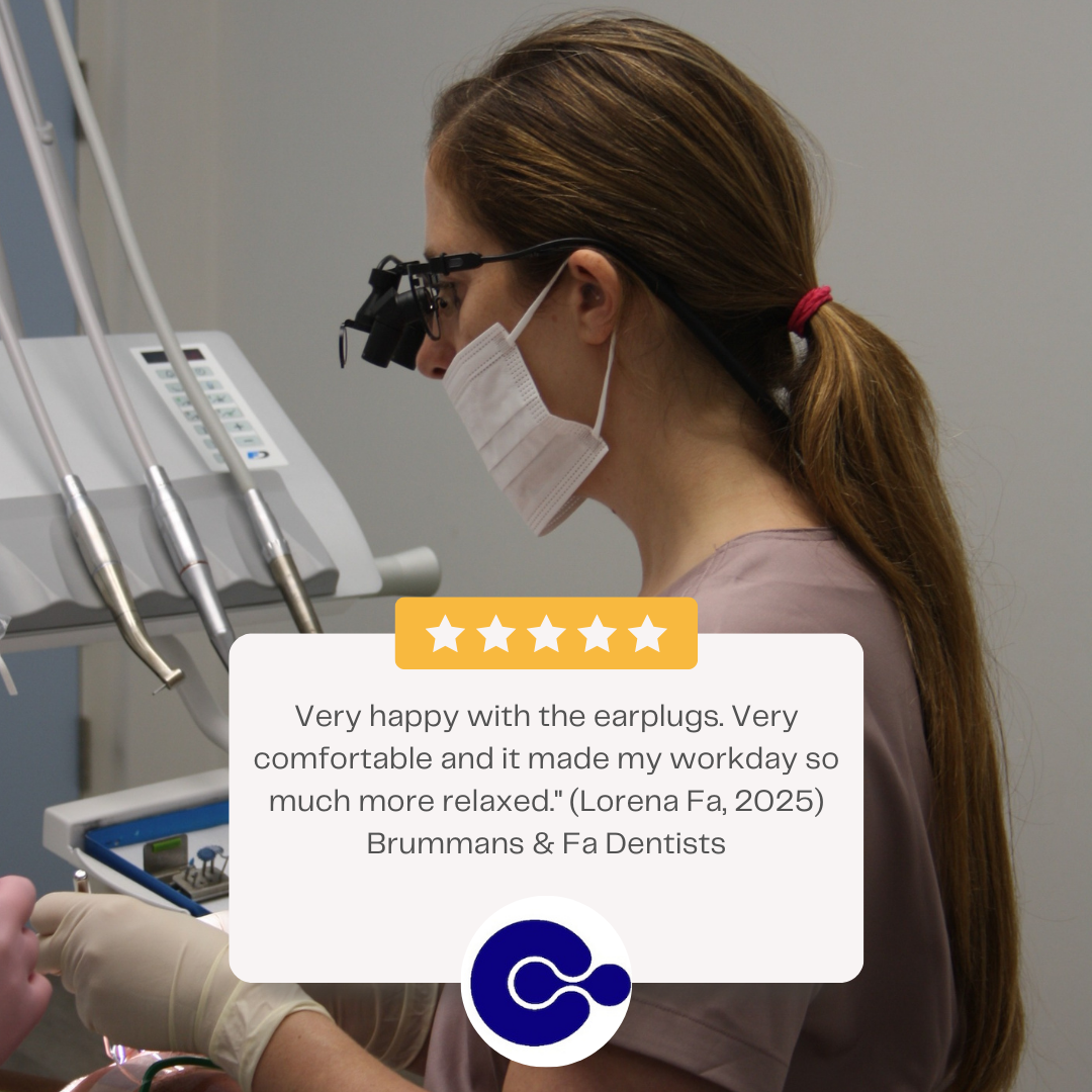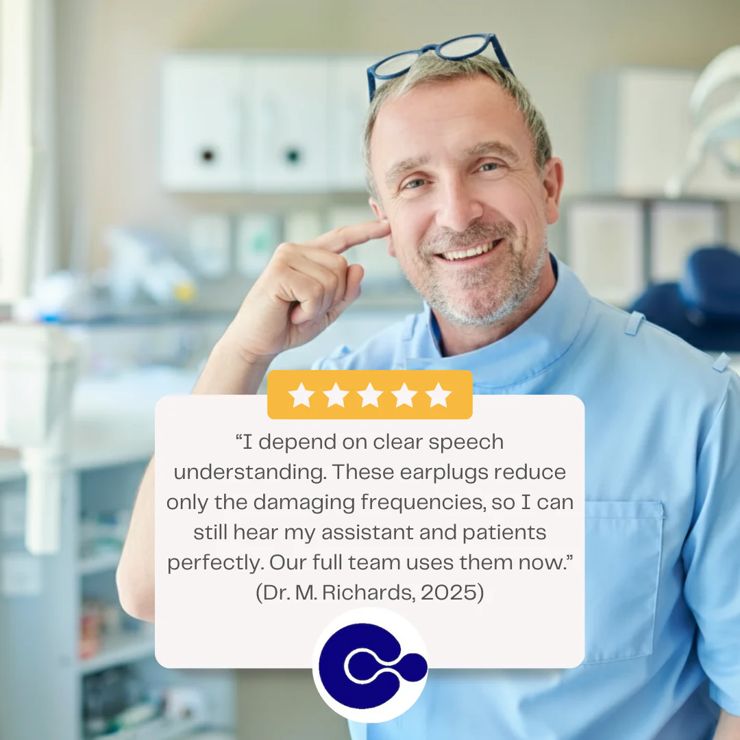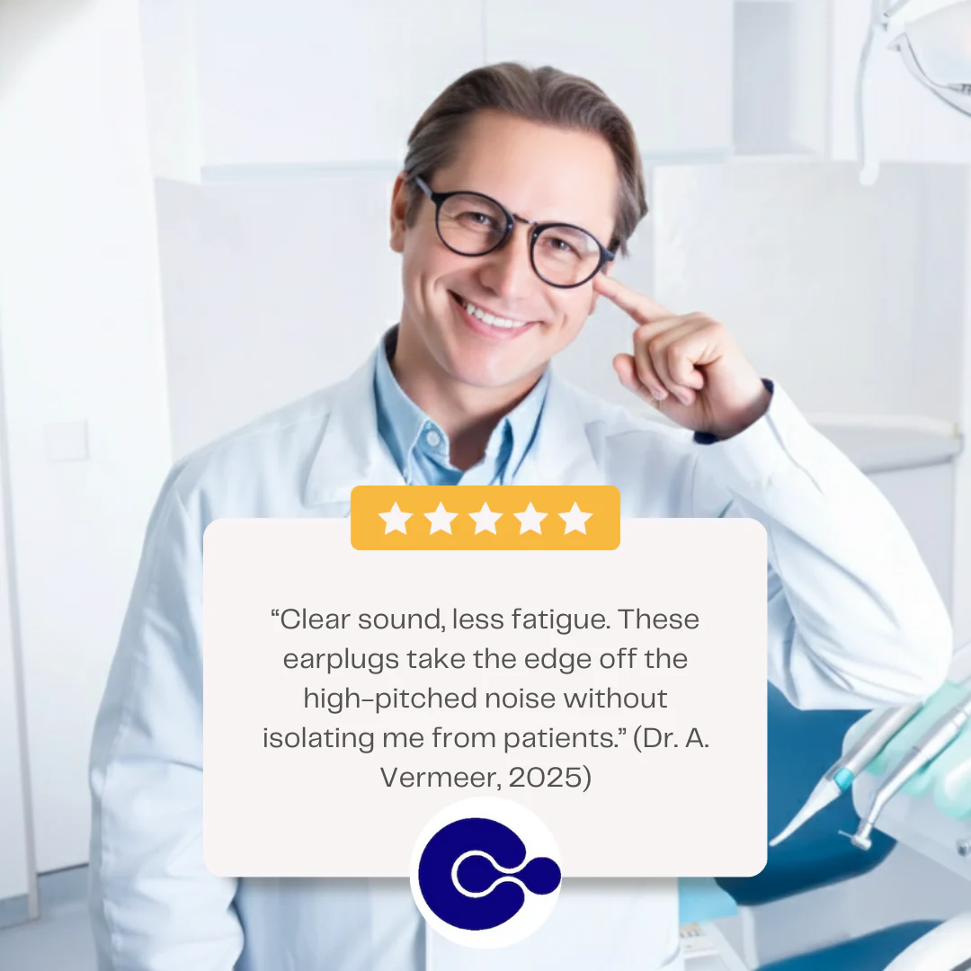 Dentists work all day with high-frequency drill noise and continuous vacuum suction, both of which can cause hearing damage, tinnitus, and mental fatigue. Proper earplugs reduce these peaks while keeping speech clear, leading to less strain and noticeably more energy at the end of the day.