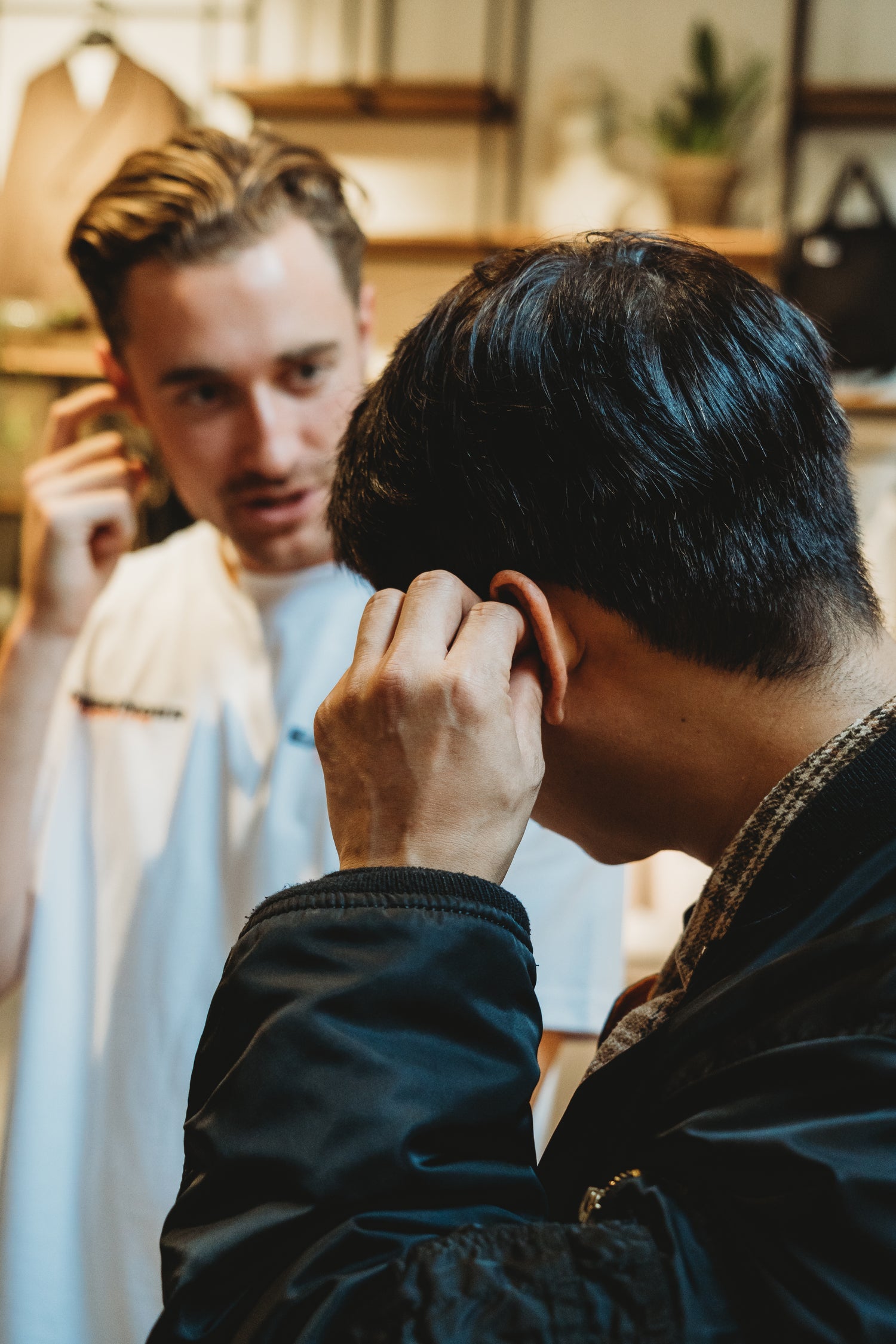 Take the string between your thumb and index finger, put it in your ear. Once sealed in the ear canal, turn and adjust so your Earasers earplug aren't visible from the front.